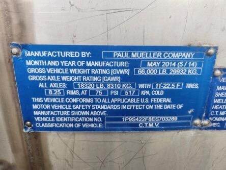 2014 PAUL MUELLER COMPANY Tandem Axle Stainless Steel Food Grade Tanker Trailer - Air Ride, Fixed Axle