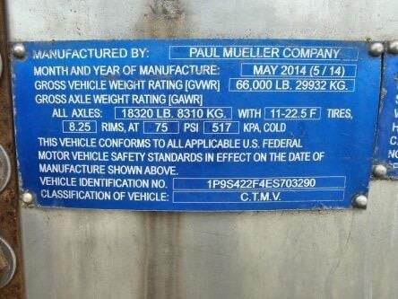 2014 PAUL MUELLER COMPANY Tandem Axle Stainless Steel Food Grade Tanker Trailer - Air Ride, Fixed Axle
