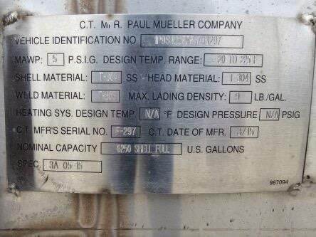 2015 PAUL MUELLER COMPANY Tandem Axle Stainless Steel Food Grade Tanker Trailer - Air Ride, Fixed Axle